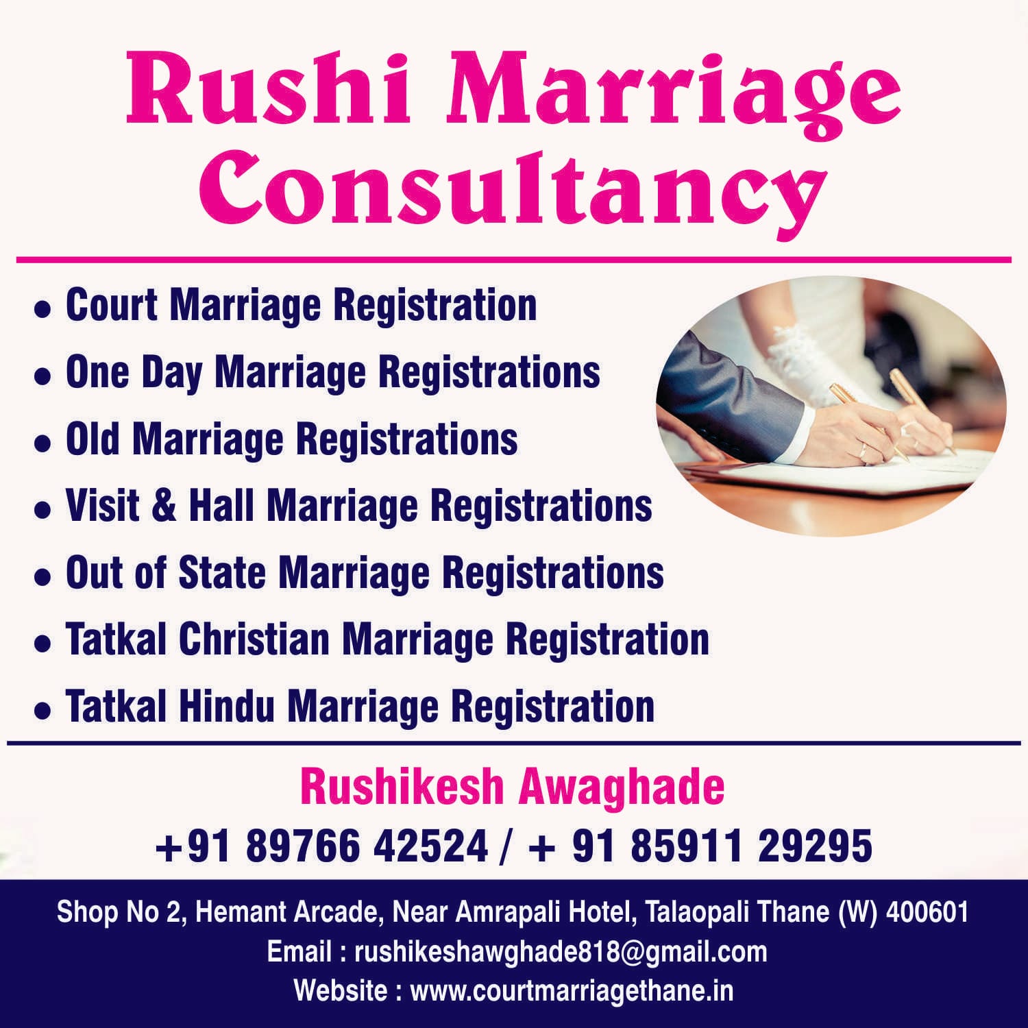Rushi Marriage Consultancy has been the most professional Court Marriage Office in Thane and so are our services. What makes us stand out is our dedicated customer interaction, same day service and the hassle-free nature of the process. We help people with the documentation and procedures required for court marriage. Rushi Marriage Consultancy is one of the best Court Marriage Offices in Thane. We provide court marriage-related services throughout the whole Thane City. Our Court Marriage Office is always available to assist and guide regarding the queries and the process for registering your marriage in the Court. We have well-qualified legal professionals who offer smart solutions and suggestions if there are any complications. Our highly experienced lawyers organize and manage the entire marriage procedure and issue legal documents like the registration certificate at the earliest.